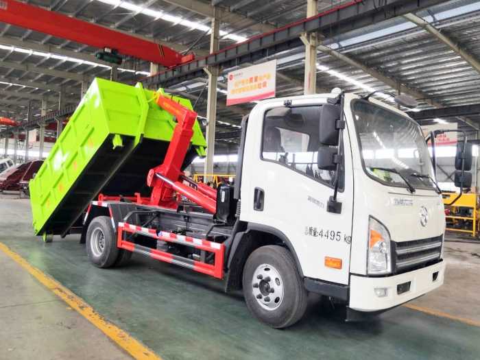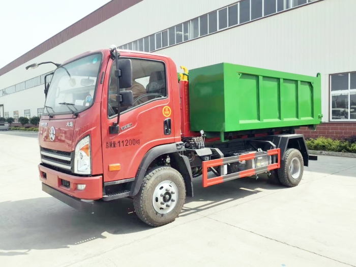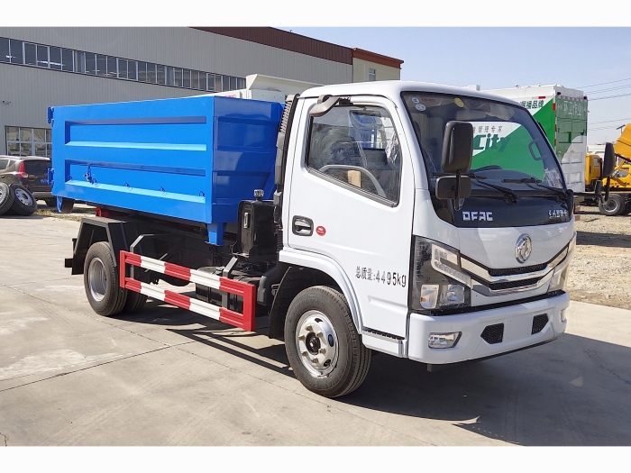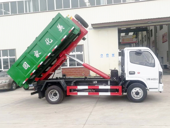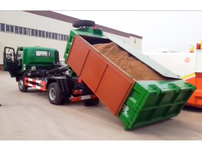 運(yùn)輸介質(zhì)為:建筑垃圾,主要是利用勾臂垃圾車底盤自帶的發(fā)動機(jī)為動力,通過變速箱上安裝的取力器,取力器處安裝油泵,采用液壓機(jī)構(gòu)手動或電控來實現(xiàn)箱體的上鉤、下卸、自卸等功能。車輛的箱體采用優(yōu)質(zhì)炭鋼板全密封焊接結(jié)構(gòu),具有重量輕、不產(chǎn)生二次污染等優(yōu)點。